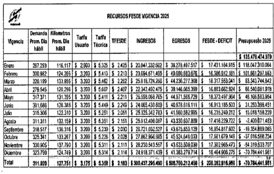 Que, en cumplimiento de lo dispuesto en el numeral 2 de la cláusula segunda del otrosí 9 en cita, mediante comunicación oficial No. 913.102.2.1891.2024, fechada del 1 de agosto de 2024, Metro Cali S.A. en Acuerdo de Reestructuración, presentó ante el Departamento Administrativo de Hacienda y la Secretaría de Movilidad los resultados del “Estudio Técnico, Legal y Financiero Recursos FESDE 2025 y Proyección tarifa técnica 2025 vs tarifa técnica 2024”, para cubrir el diferencial tarifario de la operación del SITM-MIO para la vigencia 2025, en cual entre otros temas; señala que la tarifa técnica promedio del 2025 se estima cerrará en COP5.358, lo que genera un diferencial tarifario promedio por pasajero de COP2.183, y por tanto, los recursos FESDE para cubrir el diferencial tarifario del 2025 con las variables anteriormente expuestas y con una Tarifa al Usuario de COP3.200 a partir del 1 de febrero, se estiman en COP206.262.916.960, así: