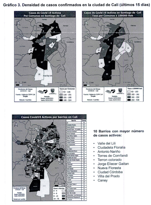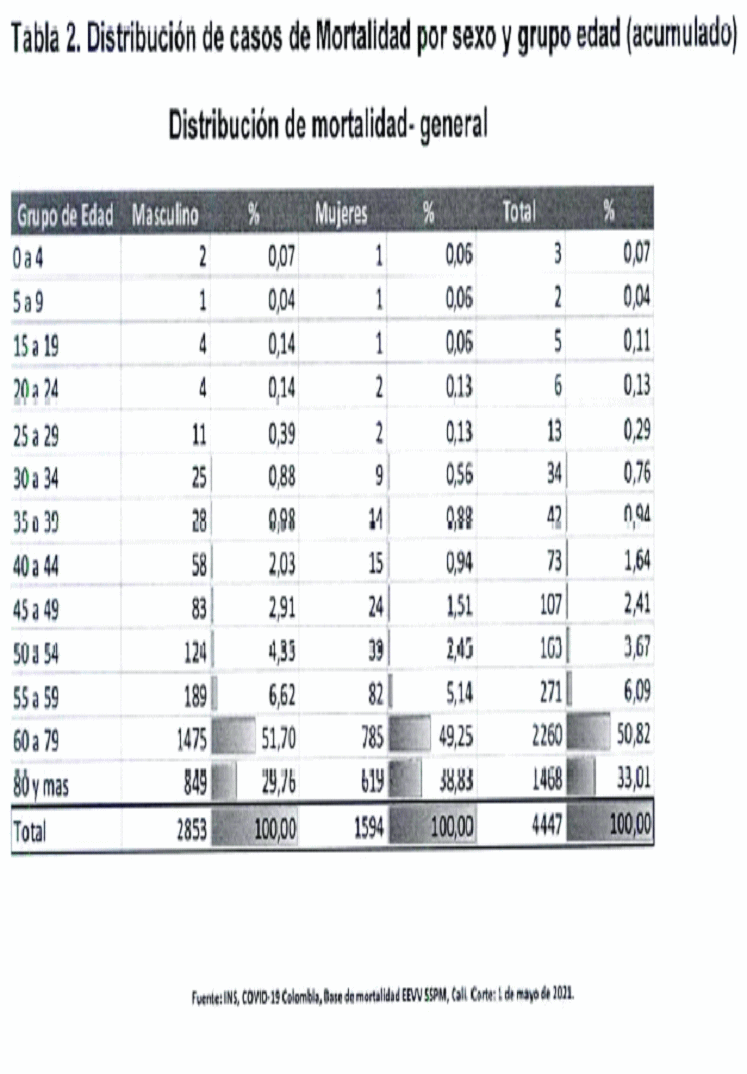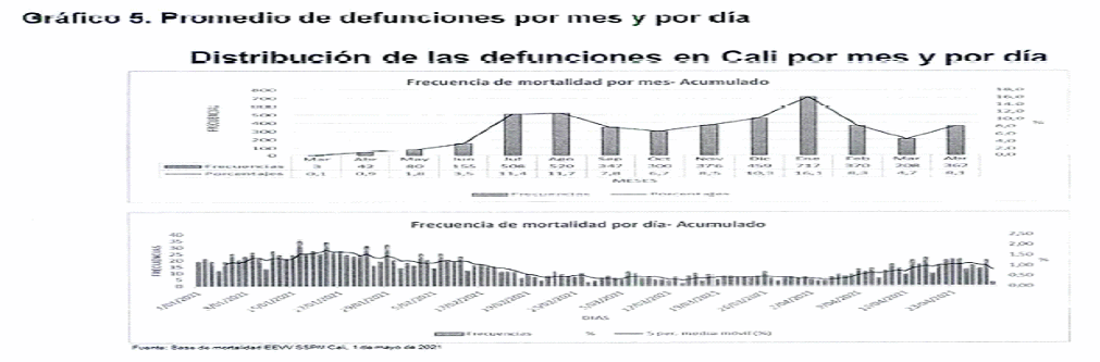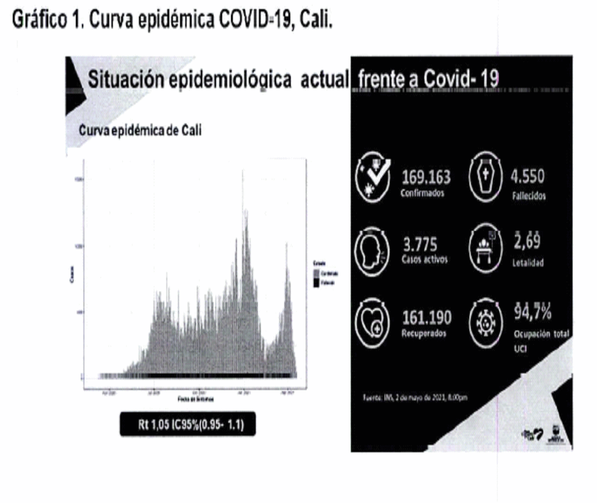 “En el Distrito de Cali, a la fecha se registran 169.163 casos confirmados por COVIID-19 y 4.550 fallecimientos acumulados por esta causa, con una tasa de letalidad del 2.69% y un porcentaje de recuperados del 93,5%. (Instituto Nacional de Salud, corte 2 de mayo de 2021) (gráfico 1).