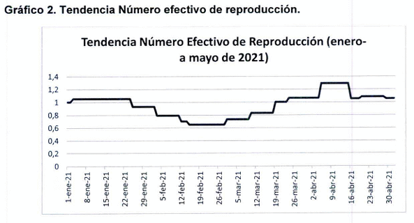 El número efectivo de reproducción (Rt) desde el mes de marzo ha tenido un incremento progresivo, manteniéndose en las dos últimas semanas estable; sin embargo, aún se encuentra sobre 1, a la fecha es de 1.05 [0.95-1.1] IC 95% (gráfico 2). El Rt actual es similar al promedio de los picos epidemiológicos presentados en meses pasados (julio 2020 y enero 2021). Se evidencia un promedio de casos alrededor de 450 casos COVID positivos diariamente.