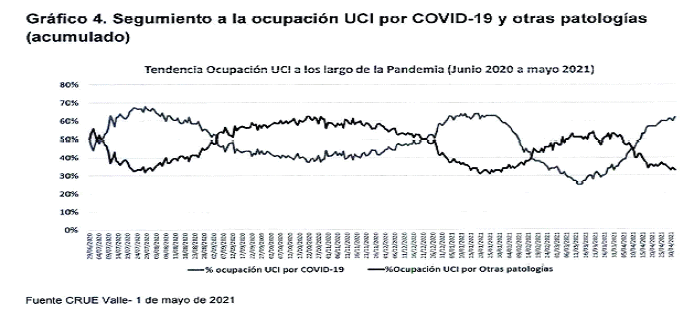 Respecto a la ocupación de las Unidades de Cuidado Intensivo UCI, se presenta un incremento significativo en el ingreso de casos covid-19 a la alta complejidad, pasando de 421 casos hace dos semanas, a 541 casos el día de hoy. El porcentaje de ocupación de camas UCI ha aumentado notablemente durante el mes de abril, alcanzando un promedio actual del 94,7% en Cali, del cual el 62% corresponde a la ocupación por COVID-19. Además, ha incrementado el porcentaje de pacientes menores de 50 años internados en UCI, donde el 21% pertenecen a este rango de edad (Tabla 1, Gráfico 4)