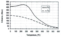 Es importante resaltar que los aceros estructurales pierden resistencia y rigidez rápidamente cuando se someten a temperaturas por encima de los 400°C; dichas perdidas no necesariamente se consideran para las fluctuaciones de la temperatura ambiente, debido a la poca variabilidad de la resistencia y la rigidez, pero no si se exponen a un incendio, tal y como se puede apreciar en las siguientes ilustraciones (variación de los esfuerzos de fluencia y Último de un acero A-36 con la temperatura, del módulo de elasticidad de un acero A-36 con la temperatura, respectivamente).