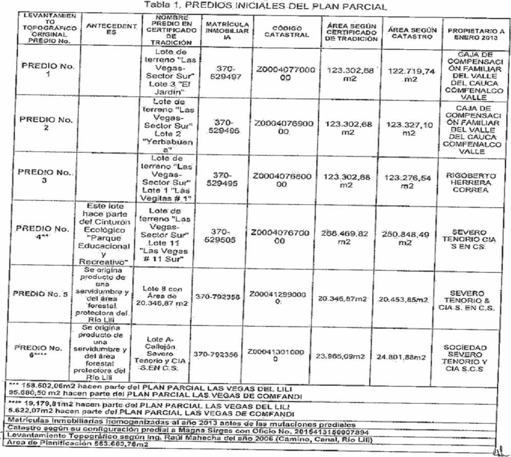 Que la resolución de viabilidad del 17 de febrero de 2016, se emitió respecto al área de planificación del pían parcial Las Vegas del Lili que corresponde a los predios que se identifican a continuación: