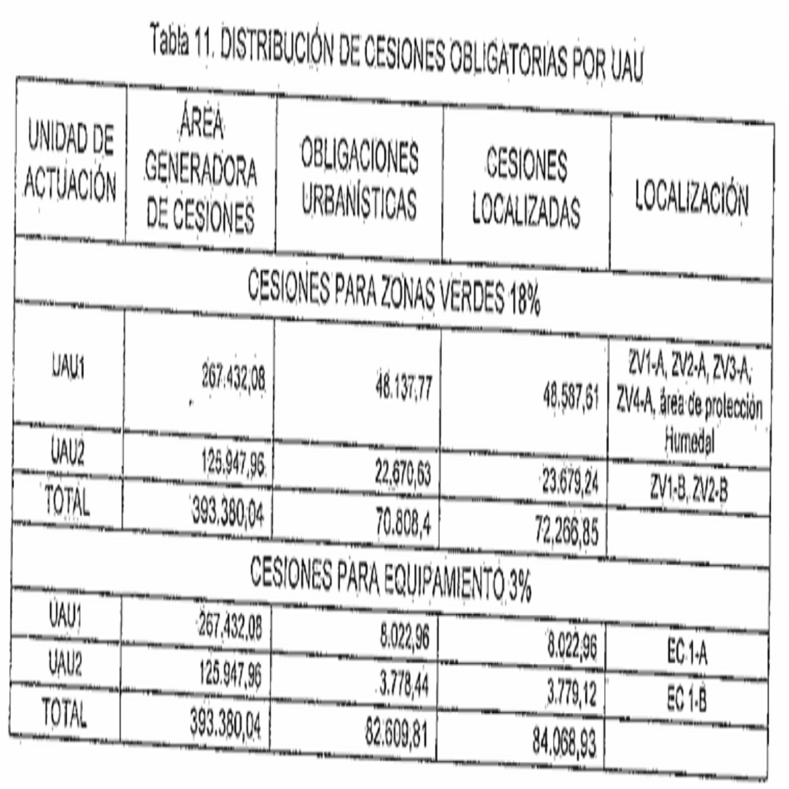ARTÍCULO 41. DISTRIBUCIÓN GENERAL DE ÁREAS POR UNIDADES DE UNIDADES DE ACTUACIÓN URBANÍSTICA. A continuación, se relaciona la distribución general de áreas para cada Unidad de Actuación Urbanística, así: