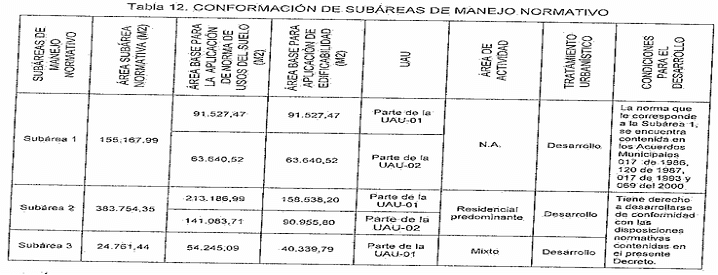 ARTÍCULO 35. SUBÁREAS DE MANEJO NORMATIVO. Para efectos de la correcta aplicación de la norma, y de las disposiciones contenidas en el presente Decreto, el presente plan parcial se encuentra conformado por tres (3) Subáreas de manejo, cuyas particularidades se precisan a continuación (ver Tabla 12 y Mapa F17 - Subáreas de Manejo Normativo):