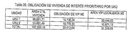 ARTÍCULO 42. OBLIGACIÓN DE VIVIENDA DE INTERÉS PRIORITARIO - VIP. En concordancia en el Decreto Nacional 1077 de 2015, en este Plan Parcial se destinará -como mínimo el 20% del área útil de los predios a la construcción de Vivienda de Interés Prioritario, que corresponde a 30.512,64 m2. Esta obligación se distribuye conforme la siguiente tabla y se muestra en el Plano FT4 LOCALIZACIÓN VIP (ver Tabla 20),