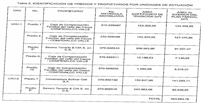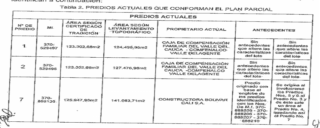 En efecto, al presentar y exponer ante las autoridades municipales (DEPARTAMENTO ADMINISTRATIVO DE PLANEACIÓN MUNICIPAL- Subdirección del Plan de Ordenamiento Territorial y Servicios Públicos-) los documentos necesarios para el trámite de un Plan Parcial, incluyó dos documentos con información no correspondiente y en este punto presento certificado de tradición del inmueble al que corresponde al folio de matrícula inmobiliaria No, 370-892136 de la ORIP de Cali, antes No. 370-529495 de la ORIP de Cali en el que aparece un área exacta de 125.947,96 metros cuadrados y, simultáneamente, levantamientos planimétricos en los que se prueba ante la autoridad de planeación municipal que el mismo lote de terreno tiene en la realidad un área física igual a 141.083,71 metros cuadrados, esto es, existe una disconformidad igual a 15.135,75 metros cuadrados (diferencia de área entre los 141.083,71 metros cuadrados que existen en la: realidad del lote de terreno propiedad de la sociedad CONSTRUCTORA BOLÍVAR CALI S.A. y los 125 947,96 metros cuadrados que aparecen en los títulos inmobiliarios respectivos),(…)"