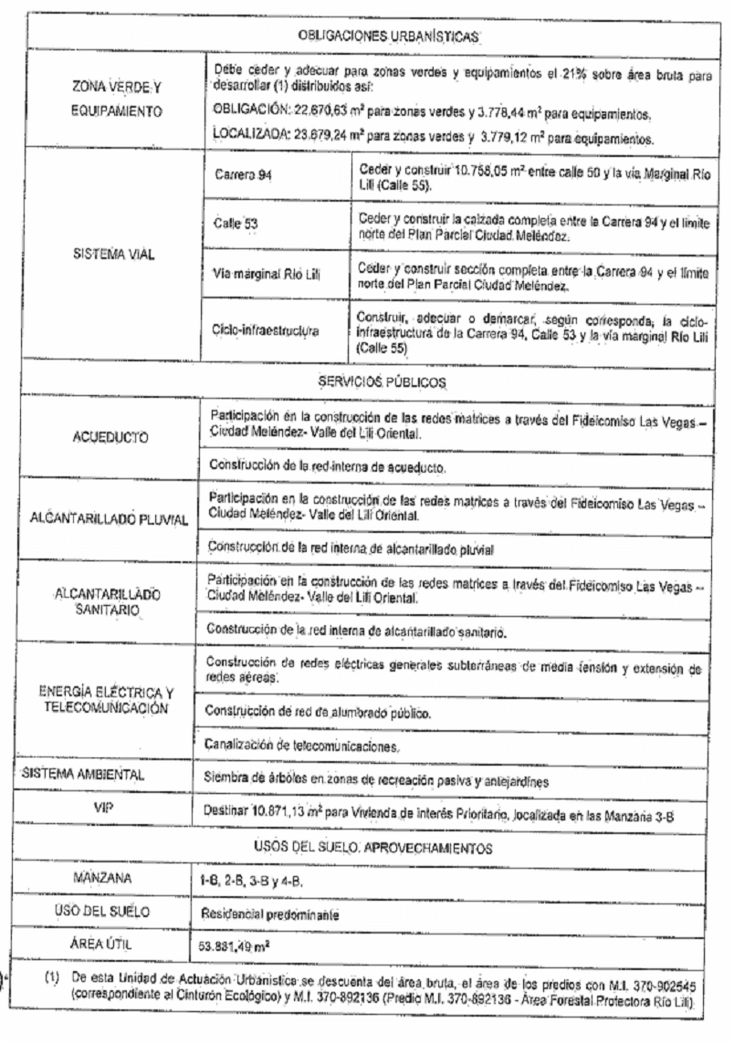 Que en el Documento Técnico de Diagnóstico - DTD aportado en la formulación del 06 de marzo de 2015, respecto a la solución de servicios públicos domiciliarios de acueducto y alcantarillado en el área del plan parcial, se relaciona como antecedente que para el desarrollo de las obras de infraestructura de los servicios públicos domiciliarios de acueducto y alcantarillado sanitario y pluvial de los predios ubicados en la zona norte del Área de Expansión Corredor Cali - Jamundí, el día 30 de julio de 2007, las empresas COMFANDI, COMEENALCO VALLE, CONSTRUCTORA MELÉNDEZ S.A. y CORFICOLOMBIANA S.A., constituyeron el Fideicomiso denominado "LAS VEGAS- CIUDAD MELÉNDEZ- VALLE DEL LILI ORIENTAL", y a través de él, un Patrimonio Autónomo para que se administraran los recursos necesarios que permitirían contratar la elaboración de los diseños y presupuestos y la construcción de las obras necesarias para la dotación de redes matrices de acueducto, alcantarillado pluvial y alcantarillado sanitario, y demás obras complementarias realizadas.