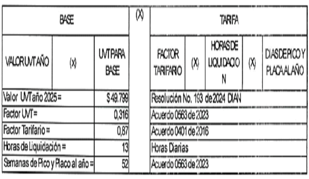 - Acuerdo No. 0563 de 2023, Artículo 7 (Liquidación por día): El mismo acuerdo define la metodología para la liquidación del valor a pagar por día, señalando que "se tomará el valor de la tasa por congestión al mes y se dividirá entre 4 semanas del mes por la cantidad de días de restricción a la semana".