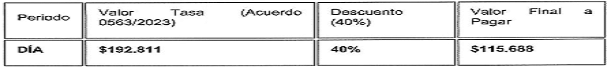La aplicación del descuento del 40% al valor diario (reduciendo el valor de $192.811 a $115.688) se justifica en la potestad otorgada al Alcalde por el parágrafo del artículo 6o del Acuerdo 0563 de 2023, con el fin de responder a las condiciones socioeconómicas locales con respecto a la disposición de pago. Este descuento asegura una tarifa más asequible para los usuarios ocasionales, promoviendo la inclusión y el cumplimiento de la norma.