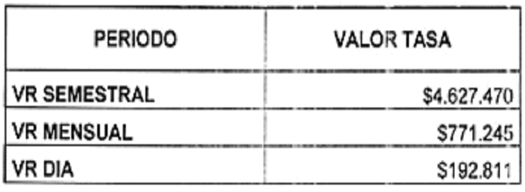 | PERIODO | VALOR TASA | DESCUENTO | VALOR A PAGAR |