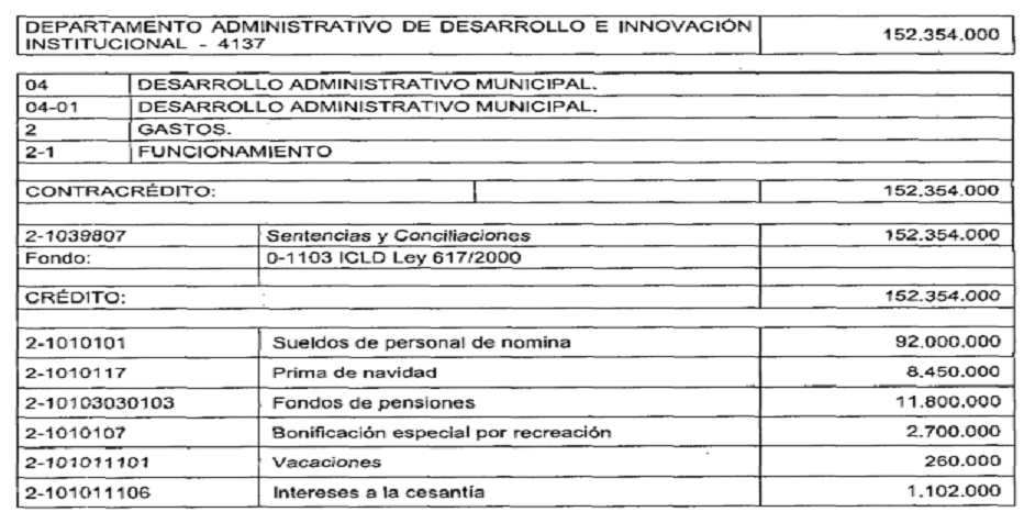 Que una vez agotadas las Instancias anteriormente descritas, fue necesario solicitar a Departamento Administrativo de Hacienda Municipal, mediante oficio No. 202041370400020664 de mayo 05 de 2020, una modificación presupuestal, afectando el presupuesto de funcionamiento del Departamento Administrativo de Desarrollo e Innovación Institucional, aprobado por el Honorable Concejo mediante el acuerdo 0465 de diciembre 09 de 2019, a nivel de objeto de gasto, contrarrestando en el rubro de Sentencias y Conciliaciones en $152.354.000 y acreditando en el mismo valor distribuido en los rubros de servicios personales asociados a la nómina y los rubros de contribuciones inherentes a la nómina, con el fin de garantizar los recursos necesarios para dar cumplimiento a la mencionada Sentencia de Tutela.