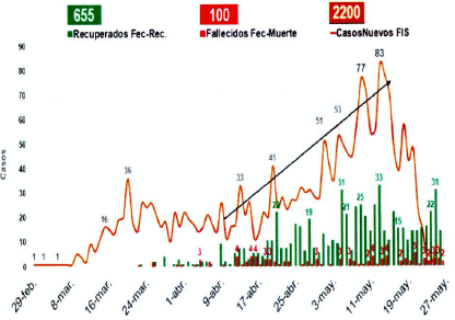 El número de reproducción RT del virus al inicio de la pandemia estaba por encima de 3, lo que quiere decir que cada persona infectada contagiaba más de 3 personas con que tuviera contacto. Luego, por la cuarentena se logró disminuir el RT por debajo de 1, reflejo del control que se estaba ejerciendo en la reproductiva del virus. Sin embargo, en los últimos días, el RT subió a 1.21 que significa que por cada persona infectada tenemos más de 1 persona contagiada que a la fecha ha generado un crecimiento exponencial de la trasmisión, con un promedio diario de pacientes diagnosticados positivos de 100 en la última semana.