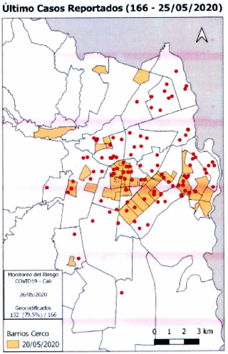 Para tal efecto se realizaron dos análisis, el primero de ellos de carácter descriptivo con el objetivo de identificar puntos calientes que consistió en un análisis de densidad de Kernel con un radio de 750 metros. El segundo, fue analítico con el objetivo de identificar conglomerados, por medio de un análisis de auto correlación espacial local bivariado de sectores hexagonales (h=750 metros), donde se cruzaron el número de casos confirmados en cada sector con el número de casos probables de los sectores vecinos. Finalmente, el mapa resultante se cruzó con la capa de manzanas y barrios. Estos barrios están siendo permanentemente vigilados y el seguimiento que se ha venido realizando demuestra que pueden variar cada dos semanas de acuerdo al movimiento del virus y las estrategias de contención aplicadas en la estrategia de los micro territorios, estas zonas calientes son: