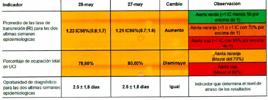 Que con base en las estimaciones realizadas por el INS, divulgadas en www.ins.gov.co en el documento producido por el Observatorio Nacional de Salud “Modelos de transmisión de Coronavirus COVID-19, escenarios para Colombia”, cuyas proyecciones se actualizan para el seguimiento que realiza el Ministerio de Salud y Protección Social en los Comités Estratégicos de Salud, con corte al 20 de mayo de 2020, el numero reproductivo en tiempo real Rt para el país es de 1,33 con valores para ciudades que oscilan entre 0,72 para Medellín y 1,37 para Cartagena.