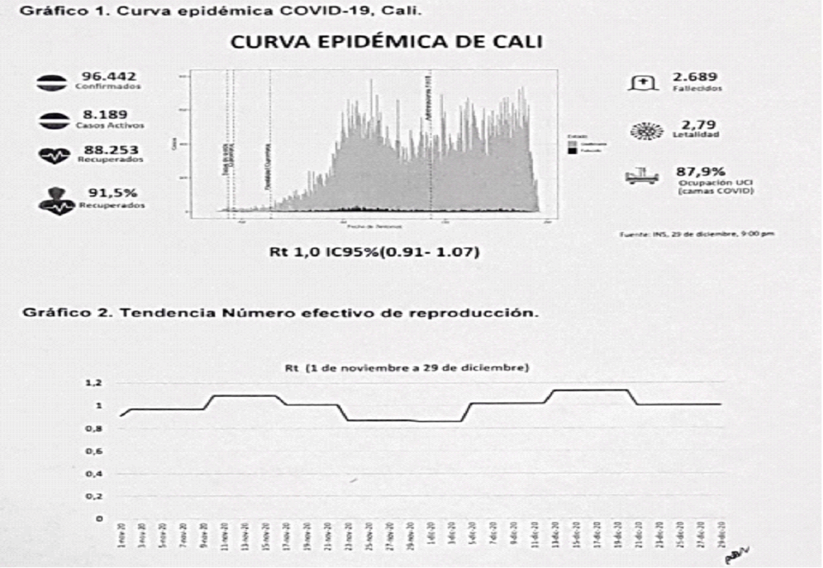 "En el Distrito de Cali, según el reporte del Instituto Nacional de Salud, se registran 96.442 casos confirmados por COVID-19 y 2.689 fallecimientos acumulados por esta causa (corte 29 de diciembre de 2020) (gráfico 1).